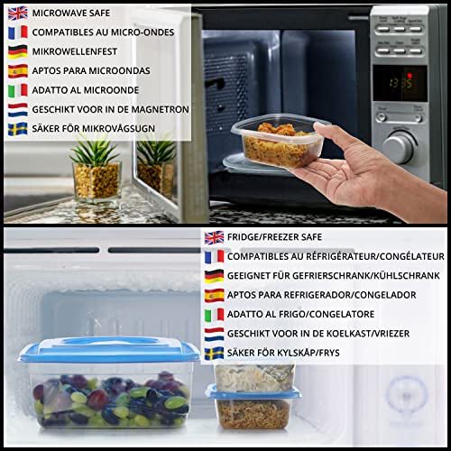 CONTENITORI CIBO ASSORTITI: Il set di 21 contenitori plastica per alimenti con coperchi blu, soddisferà tutte le tue esigenze. Comprende 5 contenitori microonde di forma sia rettangolare sia rotonda. Per un elenco completo di dimensioni, capacità e quantità, vedere immagine 2. Sono realizzati in polipropilene alimentare di alta qualità che li rende sicuri per conservare qualsiasi cibo o liquido. Sono privi di BPA e tossine. Si prega di lavarli accuratamente prima del primo utilizzo.