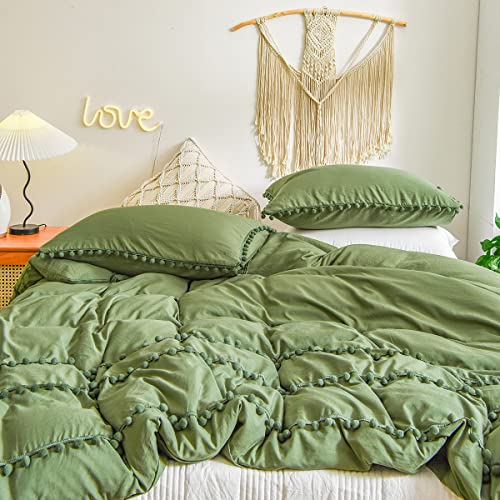 Freyamy Biancheria da letto della Boemia, 200 x 200 cm, 3 pezzi, verde scuro, pom boho chic, biancheria da letto in microfibra, con chiusura lampo e 2 federe da 80 x 80 cm
