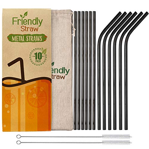 Friendly Straw Confezione da 10 cannucce riutilizzabili in metallo da 26,7 cm x 63,5 cm, 5 cannucce dritte in acciaio inox a 5 gomiti con pennelli e sacchetto (finitura nera)