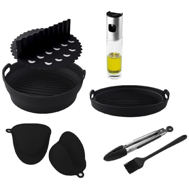 Cecofry Silicone Pack Accessories Accessori Cecofry Silicone Pack. Kit di accessori per friggitrici ad aria da 5 a 6,5 litri composto da stampo, divisore, presine, pennello, pinze e oliera spray. Godi della versatilità offerta dai 6 accessori progettati esclusivamente per friggitrici ad aria da 5 a 6,5 litri di capacità. Allarga i tuoi orizzonti culinari e prepara un'infinità di ricette grazie agli accessori in dotazione. Rivestimento altamente antiaderente per cucinare senza preoccupazioni e pulire senza sforzi. Gli accessori sono lavabili in lavastoviglie, rendendone la pulizia ancora più facile dopo ogni uso. Progettati per diverse friggitrici e capacità, questi accessori sono pratici e funzionali. Inoltre, sono privi di BPA, il che li rende completamente sicuri per l'uso. Stampo in silicone, separatore in silicone, 2 guanti in silicone, spazzola in silicone, pinze in silicone, flacone dispenser