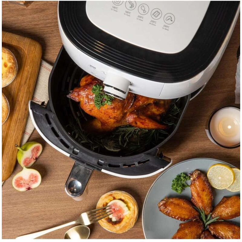 Questa pratica e compatta friggitrice ad aria calda Kasanova offre un'alternativa per la cottura dei fritti. Grazie al sistema a rapida circolazione dell'aria ad alta temperatura, potrai cucinare tutti i tuoi piatti senza l'aggiunta di olio, per una cucina più leggera. La potenza dell'aria calda garantisce cotture omogenee all'interno e una croccante crosta all'esterno, senza rischio di schizzi e odori di fritto in cucina. Il cestello antiaderente da 4 litri è perfetto per cucinare grandi quantità di cibo e può essere facilmente rimosso e pulito con un semplice lavaggio a mano. La temperatura può raggiungere i 200° C ed essere regolata tramite le apposite manopole. Dotata di timer da 30 minuti con autospegnimento, può essere usata anche per riscaldare gli alimenti a 150° per un massimo di 10 minuti. Con manico per una presa sicura antiscottatura. Sul coperchio trovi suggerimenti per cuocere al meglio le tue pietanze. Potenza: 1400 W. Voltaggio: 220/240 V. Dimensioni: 26x32,5x34,3