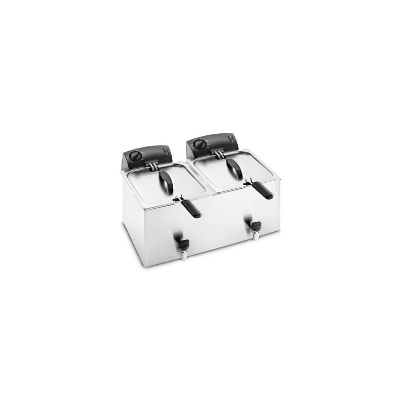 Codice RS1003 - Friggitrice elettrica da banco a 2 vasche, modello EL-ST6+6 PLUS, 230 volt, 6.4 kw, dimensioni cm. 54.7x45.9x31.5 (lxpxh), dotata di n.2 cesti da cm. 19.7x25.8x10, olio a livello 7+7 lt. Struttura in acciaio inox AISI 18/10. Rubinetti di scarico con sicurezza contro le aperture accidentali. Regolazione della temperatura dell'olio da 90° a 195°C tramite termostato. Termostato di sicurezza supplementare a taratura fissa (+220°C). Resistenze corazzate in acciaio inox.