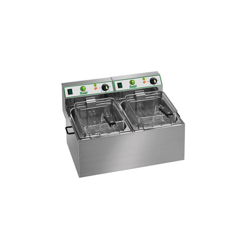 Codice RS0998 - Friggitrice elettrica da banco a 2 vasche, modello FI-FR88, 230 volt, 3.0+3.0 kw, dimensioni cm. 56.5x49x36.5 (lxpxh), vasca da lt.8+8, capacità cesto 1+1 kg, produzione oraria 8+8 kg, temperatura di lavoro 50-190°C. Struttura, vasca e coperchio in acciaio inox. Cestelli a rete estraibili in filo cromato. Manici cestelli e pomelli coperchi in plastica termoisolante. Resistenze inox. Termostato di sicurezza con pulsante di ripristino. Testata e resistenze removibili. Doppio termostato per l'utilizzo indipendente delle vasche.