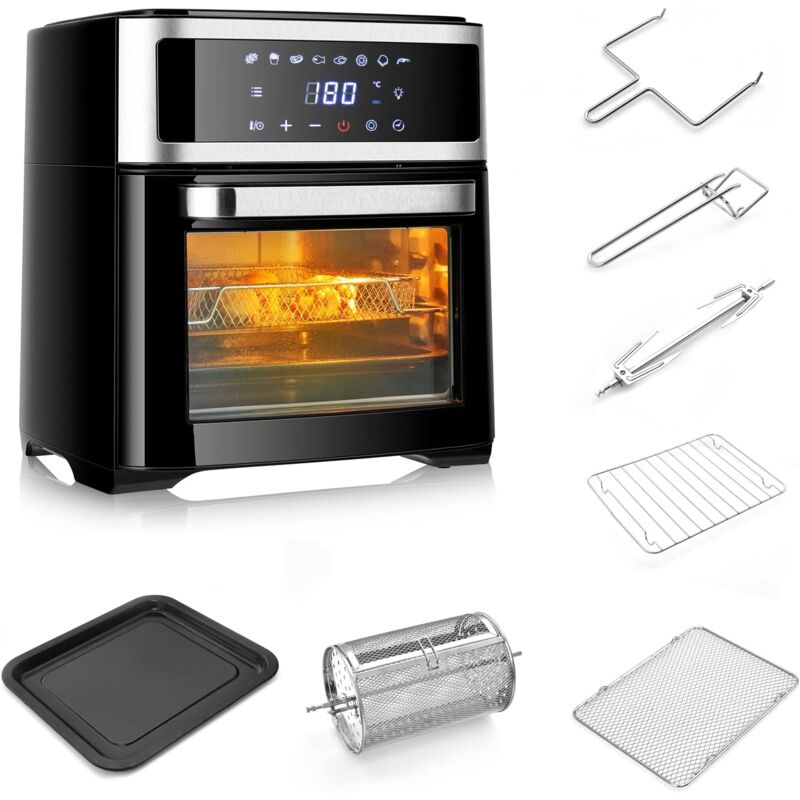 Design 8 in 1 per Uso Versatile: Il nostro forno multifunzionale ad aria ha 8 menù preimpostati come alette di pollo, patatine fritte, carne di maiale, pesce, carne di pollo, frutta essiccata, pane e gamberetti. Puoi preparare tanti piatti deliziosi in base ai tuoi gusti personali. Cibo Sano con Meno Olio: Utilizzando la tecnologia di circolazione rapida dell'aria a 360° e con un motore di 1700 W, il nostro forno ad aria riduce i grassi per poter mangiare più sano. Inoltre, la temperatura si può regolare tra 50°C e 205°C, così puoi preparare cibi croccanti all'esterno senza utilizzare l'olio. Capacità di 13 L per Uso Familiare: Con la capacità di 13 L, questa friggitrice ad aria è ottima per famiglie grandi, amici e ospiti. Puoi osservare la cottura del cibo grazie alla finestra trasparente. Inoltre, la maniglia permette di prendere comodamente il cibo e in tutta sicurezza. I cuscinetti antiscivolo la rendono più stabile senza farla oscillare. Pannello di Controllo Pratico: Il
