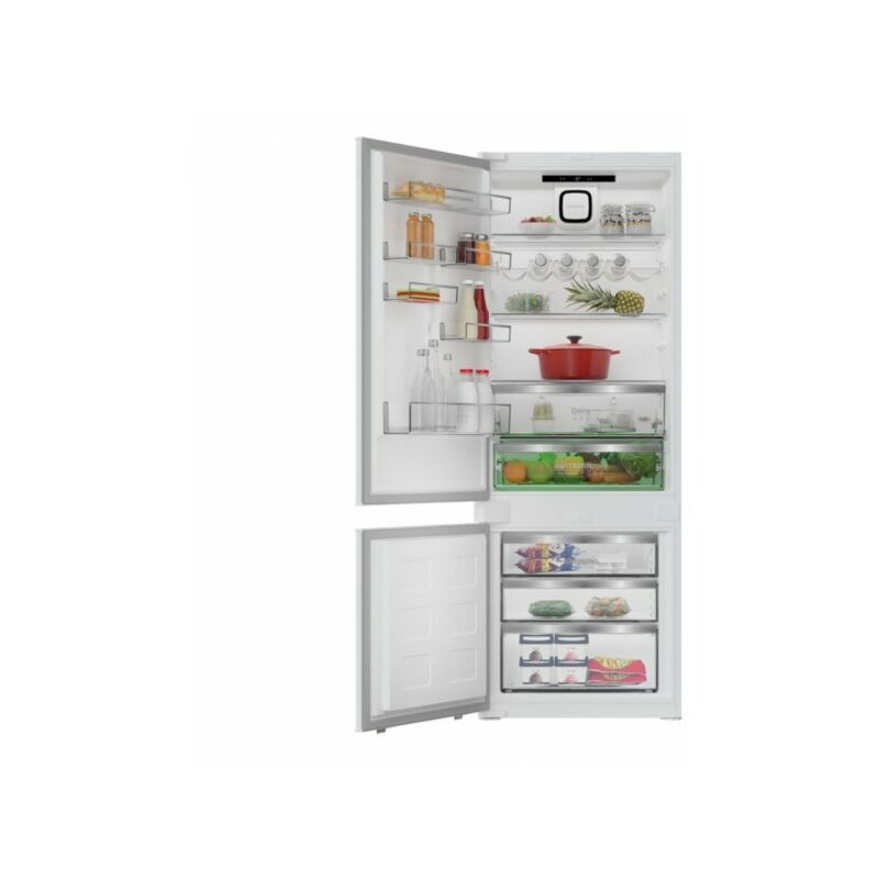 Frigorifero combinato incasso Grundig 75 cm 405 litri GKMI26940NLH classe E Caratteristiche: Frigorifero Combinato da incasso Statico con ventola Linea HIMALAYA 75 Altezza 194 cm Sistema di raffreddamento Statico con ventola Capacità Volume totale lordo, L405 L Volume netto comparto frigorifero, 300 L Volume netto comparto freezer, 100 L Allarme porta aperta Illuminazione interna Portabottiglie cromato Balconcini controporta 6 Numero ripiani vano frigo 4 Display Digitale Cassetto Frutta e Verdura VitaminZone Comparto Alimenti Freschi Caratteristiche del freezer Statico Numero di cassetti freezer 3 Vassoio cubetti di ghiaccio 2 Performances Classe di efficienza energetica E Consumo medio annuo energia, kWh / anno 240 kWh Potenza sonora dB (A) re 1 pw 35 dBA Dimensioni Dimensione prodotto (A*L*P), mm 1940x690x550 mm