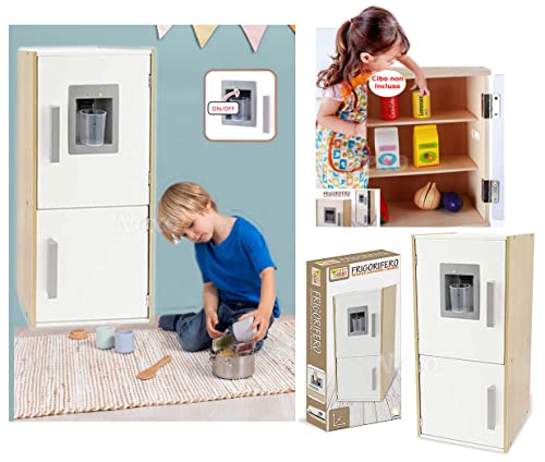 Uno splendido frigorifero in legno da StrMy Toys, frigo davvero realistico che farà sentire i vostri bambini proprio come dei piccoli grandi chef! Frigorifero in legno naturale e bianco, con struttura robusta e solida, realizzato con materiali sicuri ed atossici. Sportelli apribili, dispenser luminoso e sonoro, bicchiere acqua. Dimensioni prodotto cm. 70 x 27 x 27. Cibi non inclusi nella confezione.