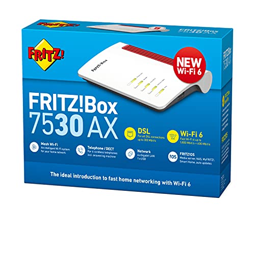 AVM FRITZ!Box 7530 AX Edition International, Modem Router Wi-Fi 6 Dual Band fino a 2.400 MBit/s, ADSL/VDLS fino a 300 MBit/s, Mesh, Base DECT, Media Server, Interfaccia in italiano