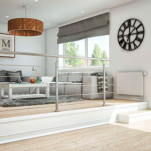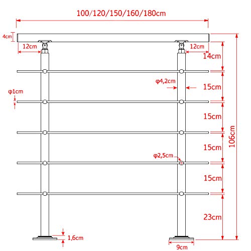 Corrimano per scale: diverse lunghezze disponibili: 80 cm/100 cm/120 cm/150 cm/160 cm/180 cm/200 cm, numero di barre trasversali: 0/2/3/4/5, altezza colonna: 106 cm (braccioli non inclusi). Materiale corrimano + colonna: acciaio inossidabile, colore: argento, diametro tubo: 42 mm.