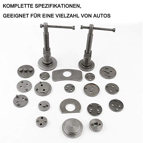 【23 pezzi Universal Brake Piston Retainer Set】Dimensione esterna del pacchetto: 32×22,5×6cm, Incl. 2 mandrini + 2 piastre di ritenzione + 18 adattatori + 1 custodia in plastica.