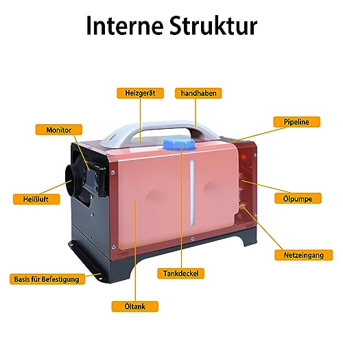 【Riscaldatore di parcheggio a diesel】Dimensioni (LxPxH): 25x40x31cm, Potenza nominale: 8KW, Tensione nominale: 12V, Carburante: Diesel, Capacità serbatoio: 5L, Diametro uscita aria: 7cm, Consumo di carburante: 0,18-0,48L/h, Temperatura di funzionamento: da -40 a +50°C, Distanza effettiva per il rilevamento remoto: 10-20m, Protezione contro il surriscaldamento: 240°C.