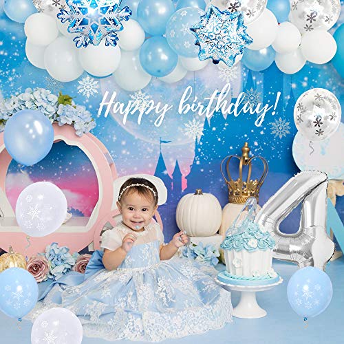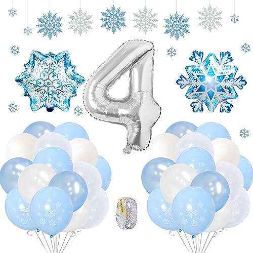 【Set di palloncini di compleanno】: la confezione include: 1 palloncino numero 4 (32 in) + 10 palloncini fiocchi di neve (blu e bianco) + 5 palloncini bianchi + 5 palloncini blu + 2 palloncini grandi con fiocco di neve + 4 fiocchi di neve (blu e bianco) + 1 nastro d'argento