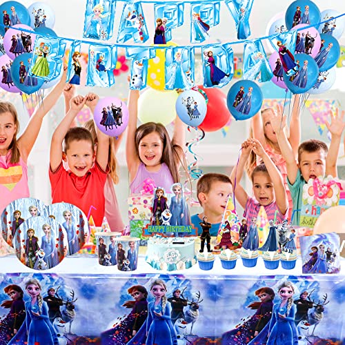 Frozen Stoviglie per Feste,81Pcs Kit Compleanno Frozen,Frozen Compleanno Decorazioni Festa,Piatti,Tazze,Tovaglioli,Tovaglie,Striscioni,Palloncini,topper per torta,per Bambini Ragazze