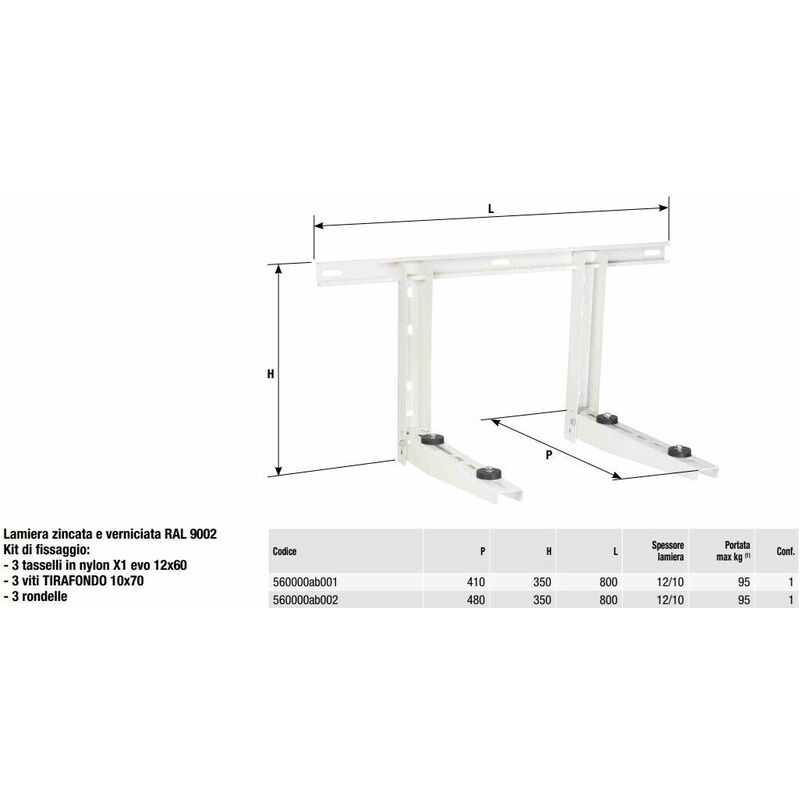 Coppia staffe per climatizzatore installazione a parete Lamiera zincata e verniciata RAL 9002 Kit di fissaggio: - 3 tasselli in nylon X1 evo 12x60 - 3 viti TIRAFONDO 10x70 - 3 rondelle MISURE Profondità 480mm Altezza 350mm Larghezza 800mm Spessore lamiera 12/10 Portata max 95kg