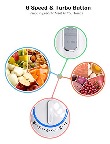 【6 Impostazioni di Velocit & Turbo Boost】 Dotato di 6 velocità e pulsante turbo, puoi regolare liberamente la velocità per adattarla a cibi e scopi diversi. Il pulsante TURBO aumenta il frullatore alla sua velocità massima, che aggiunge più potenza per ingredienti più duri o lavori di miscelazione difficili, in modo da poter ottenere una miscela più omogenea.
