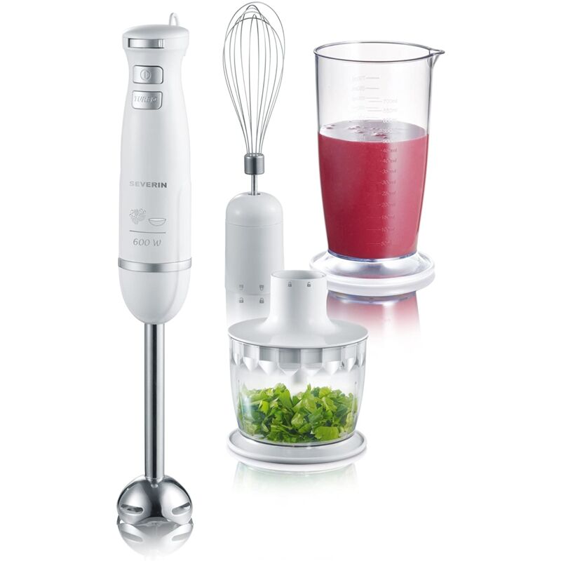 Potenza: 600 W Frullatore a immersione facile da maneggiare Piedino miscelatore removibile in acciaio inox, facile da pulire sotto l'acqua corrente Interruttore on-off Funzione di velocità turbo aggiuntiva max. ca. 13.000 giri/min Regolatore di velocità Becher per miscelare con coperchio, frusta, tritatutto e supporto a parete inclusi Anello appeso Colore: acciaio inossidabile-bianco