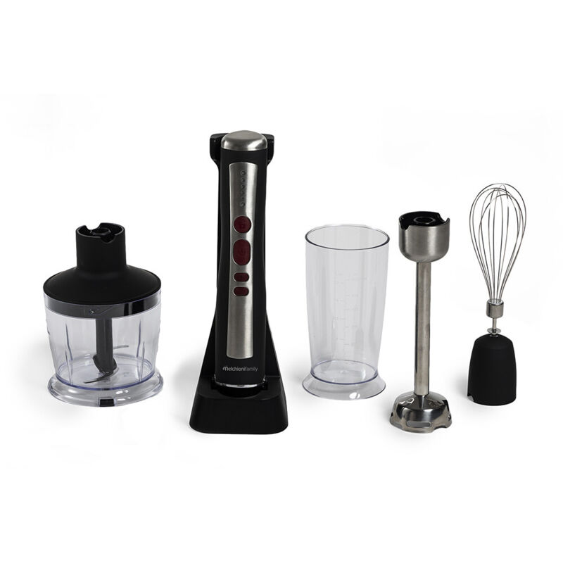 L'eleganza in cucina. Set completo di sbattitore, tritatutto, frullatore a immersione e bicchiere graduato. Potente ed efficiente dove vuoi tu. • Frullatore a batteria ricaricabile, 200 W • Stelo in acciaio inox con doppia lama in acciaio inox • Batteria agli ioni di litio da 11,1 V 2000 mAh, motore DC • Regolazione 5 velocità • Sistema di accensione con sicurezza • Indicatore di carica e di sblocco • Cavo di alimentazione di tipo C, lunghezza 60 ~ 120 cm • Indicatore luminoso per livello di potenza • Durata batteria 30 minuti, tempo di ricarica 4 ~ 5 ore • ACCESSORI INCLUSI: Frusta sbattitore, Tritatutto con doppia lama Inox da 500ml, Caraffa graduata da 600ml, alimentatore di ricarica e cavo USB-C