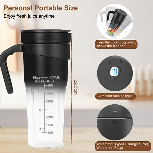 RICARICABILE VIA USB E PORTATILE- Il smoothie frullatore portatile è dotato di una batteria al litio ricaricabile da 4000mAh, che offre abbastanza potenza per preparare 20 tazze di succo fresco con una singola carica. Questo frullatore da viaggio ha una capacità di 470 ml ed è progettato ergonomicamente con una maniglia che lo rende comodo da tenere in mano, il che lo rende ideale per l'uso in palestra o in viaggio.