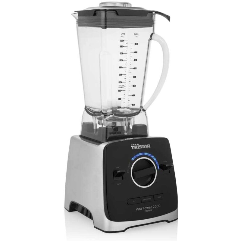 Cerchi un frullatore veloce e semiprofessionale? Con il frullatore BL-4473 VitaPower 2000 puoi frullare rapidamente deliziose zuppe, frullati e ghiaccio tritato per cocktail, ad esempio. Questo potente frullatore ad alta velocità rende la frullatura facile e veloce grazie alla sua elevata potenza di 2000 watt. Regola la velocità utilizzando il pulsante di facile utilizzo o utilizza la funzione a impulsi con cui puoi frullare alla massima velocità di 32.000 rotazioni al minuto. Seleziona uno dei tre programmi preprogrammati e prepara un delizioso frullato per tutta la famiglia Potente motore da 2000 Watt Il frullatore VitaPower è uno dei frullatori più potenti di Tristar. Ciò è dovuto al potente motore da 2000 watt, alle 6 lame in acciaio inossidabile e alla caraffa del frullatore in Tritan senza BPA. Grazie al potente motore puoi frullare anche ingredienti duri come cubetti di ghiaccio, frutta congelata, arachidi e noci. La robusta caraffa del frullatore da 2 litri è resistente a