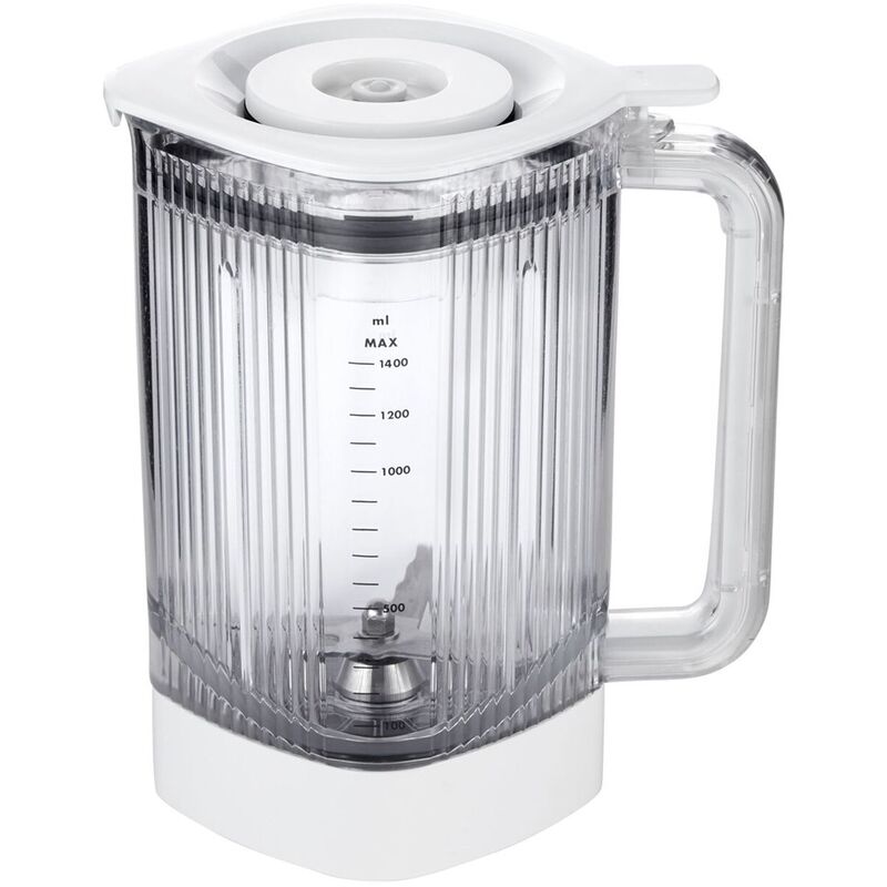 Dettagli tecnici Non contiene:Bisfenolo A (BPA) Caratteristiche Coperchio incluso:Sì Tipo di accessorio:Baffa frullatore Capacità:1,4 L Manico ergonomico:Sì Colore prodotto:Bianco Tritatutto:Sì Materiale vaso/i:Tritan Materiale lame tritatutto:Acciaio inossidabile li> Dati imballaggio Quantità per confezione:1 pezzo(i)