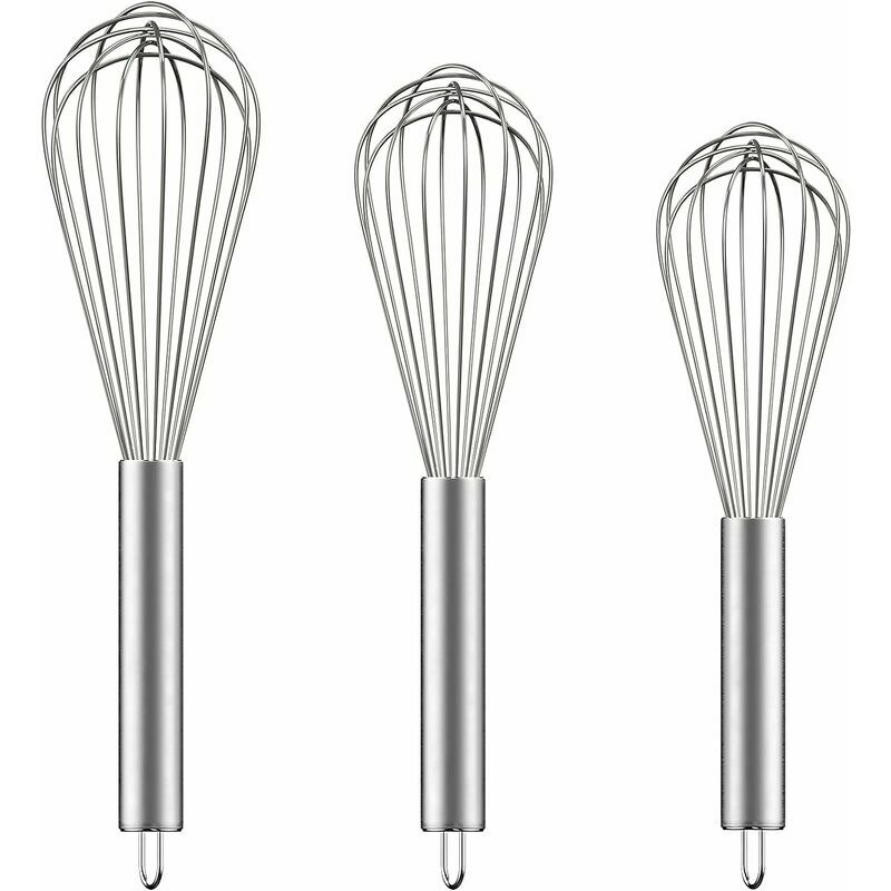 FORTE E DUREVOLE: la nostra frusta è realizzata in resistente acciaio inossidabile e metodo di lavorazione lucidato a specchio. Progettato ergonomicamente per un equilibrio e un controllo superiori, per una differenza che puoi davvero sentire nella tua mano.,Facile da pulire e conservare: le nostre fruste da cucina sono lavabili in lavastoviglie! Le estremità in acciaio inossidabile consentono di appenderlo facilmente a qualsiasi gancio della cucina e di riporlo facilmente. Un must per cuochi casalinghi e chef di ristoranti. (Si prega di appenderlo verticalmente dopo la pulizia per evitare che l'acqua penetri nel manico e si arrugginisca.) Multifunzionale: il nostro strumento da cucina wisk rende la cottura molto più semplice e piacevole. Prova la frusta più grande per grandi ciotole di pastella per pancake, la frusta media per sbattere le uova e la frusta più piccola per mescolare un piccolo lotto di vinaigrette., Flessibile: questo utensile da cucina Wisk è disponibile in 3 misure
