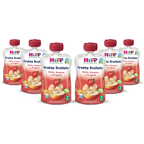 HiPP - Frutta Frullata Bio per Bambini, Purea 100% Frutta al Gusto Mela, Banana e Fragola, Senza Zuccheri Aggiunti, 6 Confezioni da 90 g