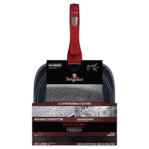 Material: forged aluminum Include: Frypan Ø20*4,5 cm 1,0L Frypan Ø24*4,8 cm 1,7L Grill pan Ø28*4,1 cm 2,1L Color: metallic burgundy