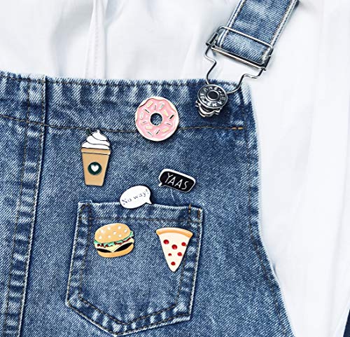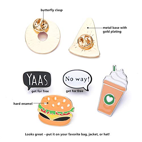 Dettaglio: set di 6 spille smaltate ispirate alla cultura pop con donut, caffè, pizza, hamburger, yass e no way per adattarsi a diversi abiti o allo zaino.