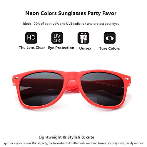 Opzioni di colore e dimensioni: questi occhiali da sole per feste anni '80 sono disponibili in 8 diversi colori eleganti. Disponibili in rosso neon, verde, rosa, rosa caldo, giallo, arancione, viola e blu. Questi occhiali da sole dai colori vivaci sono disponibili in una sola dimensione, dimensioni adatte per la maggior parte dei bambini, adolescenti e adulti.