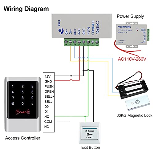 . Confezione che include tastiera impermeabile IP65, serratura magnetica da 60 kg, alimentatore, pulsante di uscita, portachiavi RFID mixcolor da 10 pezzi.