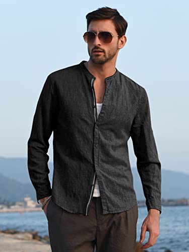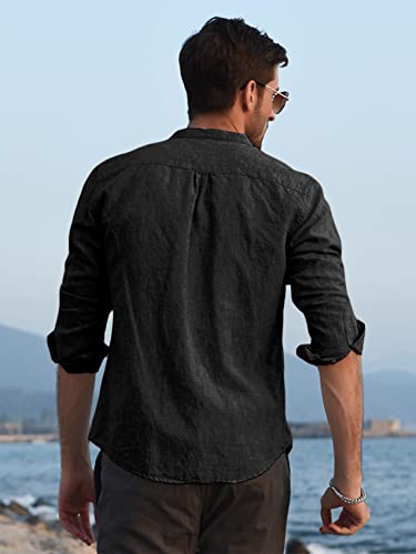 FUERI Camicia da uomo a maniche lunghe, in cotone e lino, stile casual, con bottoni a fascia, leggera, estiva, A-Nero, L