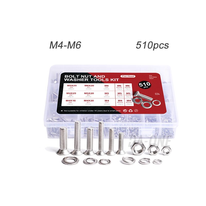 Fuienko - 510Pcs Set di dadi a bullone Phillips M4 M5 M6 viti svasate a testa tonda piatta in acciaio inossidabile dadi Kit di rondelle di bloccaggio divise,Flat Head Socket Set