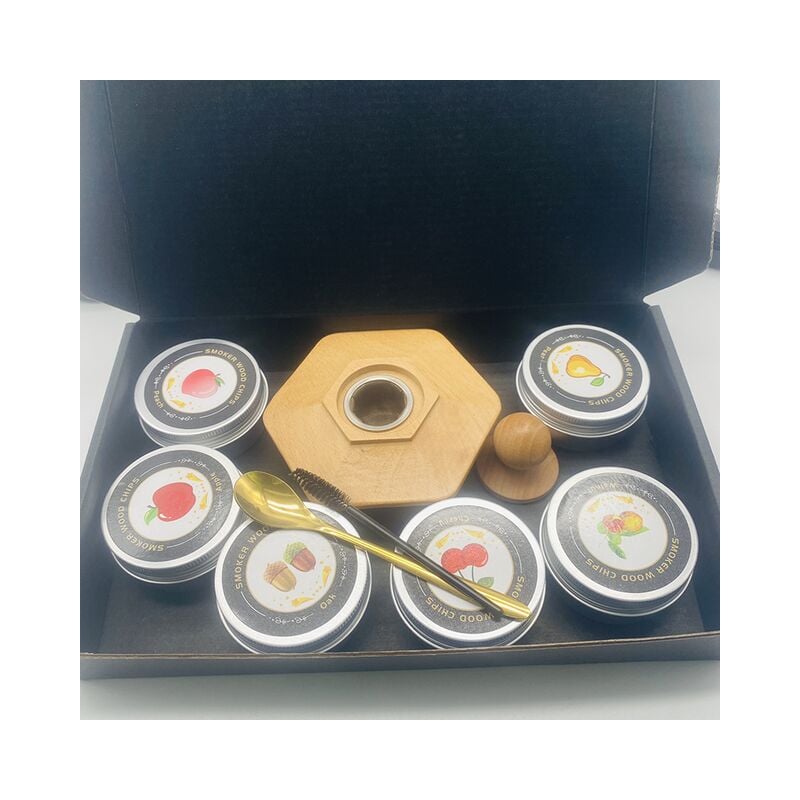 Cocktail Smoky Cover Material: Oak size: a smoker Smoker + 4 Flavor Sawdust + Cleaning Brush Set Smoker + 8 Flavor Sawdust + Cleaning Brush Set Beech hexagonal tower--6 flavors Beech Round UFO--6 flavors Note: 4 flavors of wood chips (including: 1*oak+1*cherry+1*apple+1*walnut)