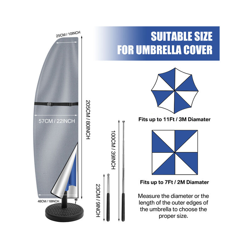 Specifiche tecniche: Materiale: tessuto Oxford 210D/420DIn Tessuto Oxford Colore: esterno nero + interno argento Pacchetto: 1 x copri ombrello + 1 x asta di spinta Dimensione della copertura dell'ombrello a Banana: Altezza 205cm: larghezza superiore: 25cm, larghezza centrale: 57cm, larghezza inferiore: 48cm;