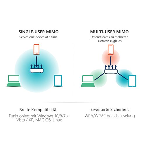 5 dBi High Gain Antenna & MU-MIMO Technology - La High Gain Antenna fornisce un segnale più forte, più chiaro. MU-MIMO utilizza diversi dispositivi allo stesso tempo e offrendo una velocità fino a tre volte più elevata. Consente di collegare più dispositivi contemporaneamente in modalità wireless presenti, senza perdita di un Performance temere.