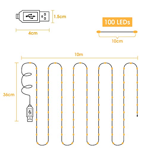 Fulighture luci a LED da 10 m, alimentate tramite USB, 100 LED a catena decorativa in argento, per interni, camera da letto, parete, Natale, feste, compleanni, patio, decorazione bianca calda, 2 Pezzi