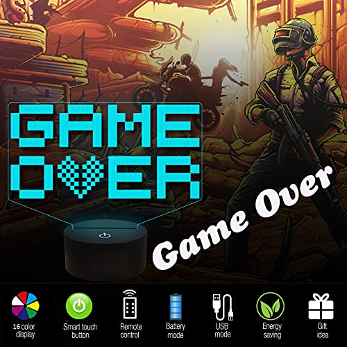 FULLOSUN Pixel Game Over Illusion Lamp, Gamepad 3D Night Light (4 modelli) con telecomando 16 RGB Cambiare colore Gaming Room Headset Decor miglior regalo giocatore