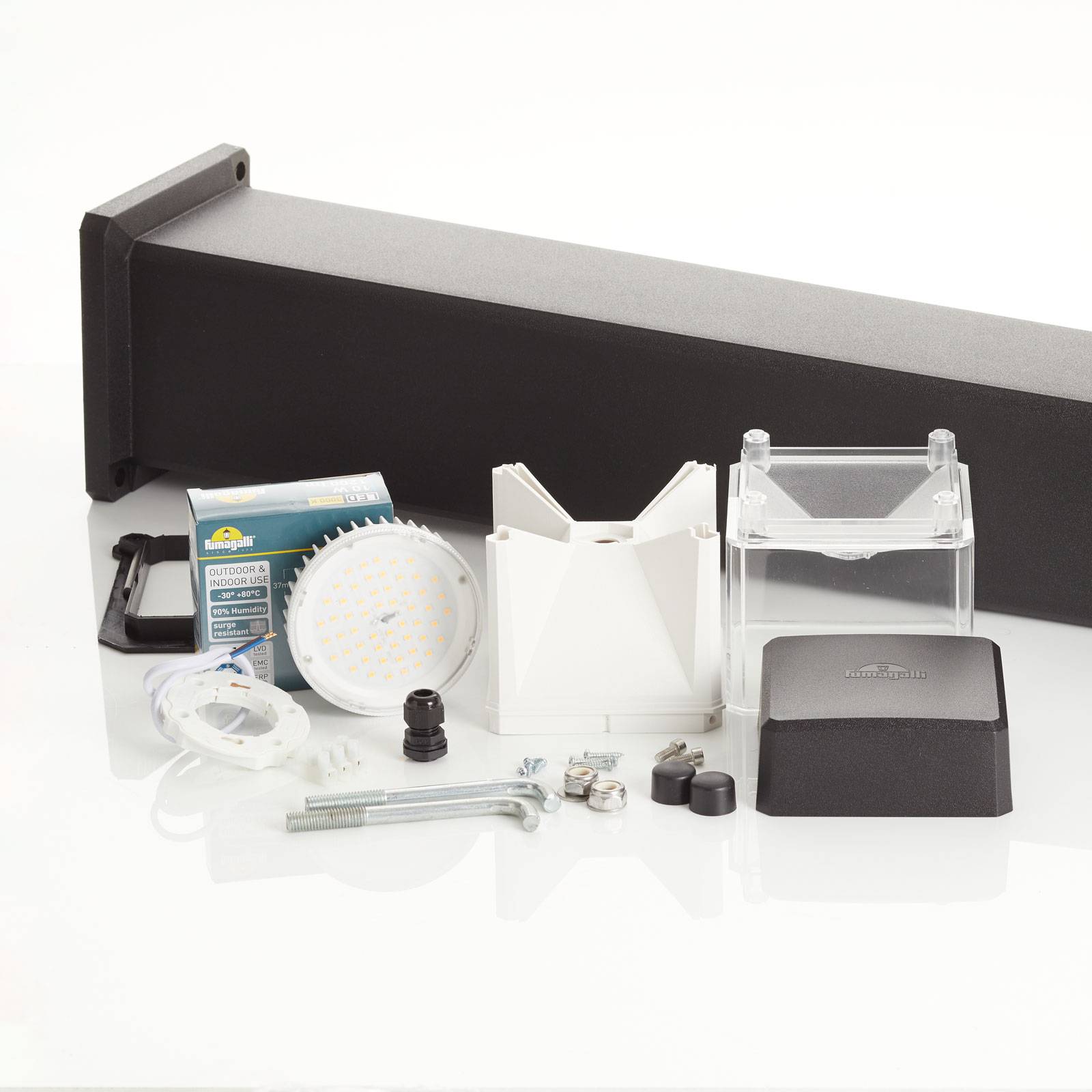 Con funzione di cambio colore - resistente luce di percorso a LED Elisa con riflettore quadrato L'apparecchio di illuminazione path Elisa è stato progettato come fonte di luce affidabile per le moderne proprietà private o i locali aziendali. L'alloggiamento in resina fusa e il coperchio in PMMA trasparente resistono in modo permanente agli effetti degli agenti atmosferici. Il modello di luce a quattro raggi, generato dal riflettore quadrato, fornisce un tocco di stile. Il colore della luce può essere impostato su bianco caldo, bianco universale o bianco luce diurna, a seconda delle esigenze, con un piccolo interruttore sulla lampada a LED GX53.
