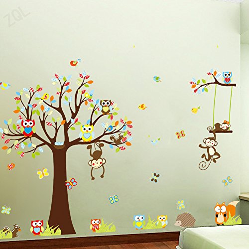Fumetto Gufi Cute Scimmie Scoiattolo Bellissimo Albero Adesivi Murali, Camera dei Bambini Vivai Adesivi da Parete Removibili/Stickers Murali/Decorazione Murale, Set Di 4 Fogli