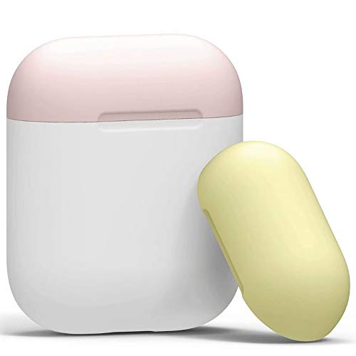 FunBand Custodia Compatibile per Apple AirPods 1 & 2, Cover Protettiva in Silicone con Due Diversi Cappucci Colorati [LED anteriore Non Visibile] (Bianco-Rosa, Giallo)