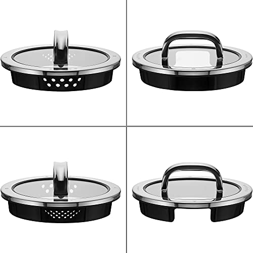 Il coperchio in vetro lavabile in lavastoviglie può essere posizionato in 4 posizioni contrassegnate: fori grandi/piccoli, aperto/chiuso per scolare o cucinare. I manici rivettati non si surriscaldano durante il processo di cottura