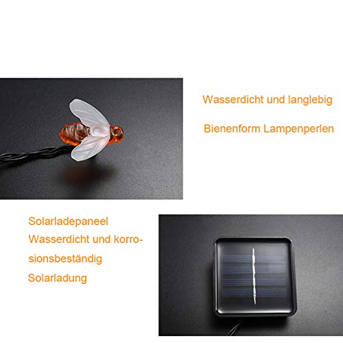 Catena di luci a forma di ape, impermeabili, classe di impermeabilità IP65, sia il pannello solare che le catene di luci a LED 30/50 miele, e la linea è lunga 6,5/7 metri, intervallo di ogni luce: 150 mm/5.9 pollici, lunghezza guida della catena luminosa: 2 metri.