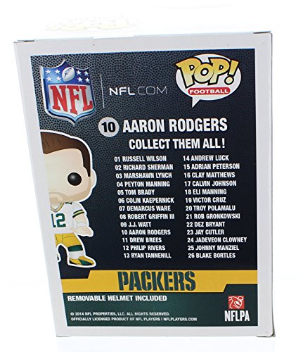 Green Bay Packers Quarterback and super Bowl Champion Aaron Rodgers Stands 3 3/4-inch Tall in Pop. Vinyl formato and Comes Packaged in ha Window Display Box. Aaron Rodgers is Sporting His Mustache and Beard and Comes in His Road Packers Uniform and Comes With A removable Packers Helmet.