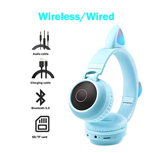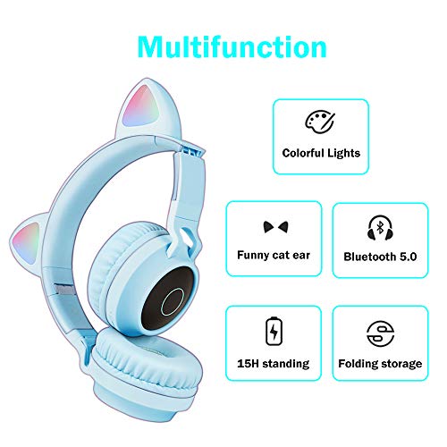 Funwaretech Cuffie per Bambini Over-Ear, Cuffie Bluetooth Wireless con Microfono, Cuffie Pieghevoli con Luce a led & Orecchio di Gatto Divertente, Mini SD/TF, Radio FM, Cuffie Morbide -Azzurro/Blu