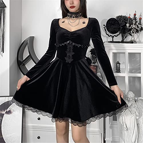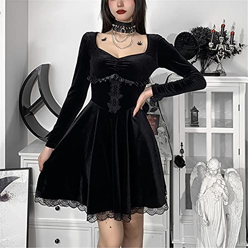 Caratteristiche: abito corto da donna gotico a maniche lunghe, stile punk gotico y2k increspato mini abito da cocktail, vintage gotico pizzo patchwork, mini abito gotico lolita, mini abito da cocktail stratificato, manica lunga fasciatura anteriore nero cosplay autunno discoteca vestiti skinny.