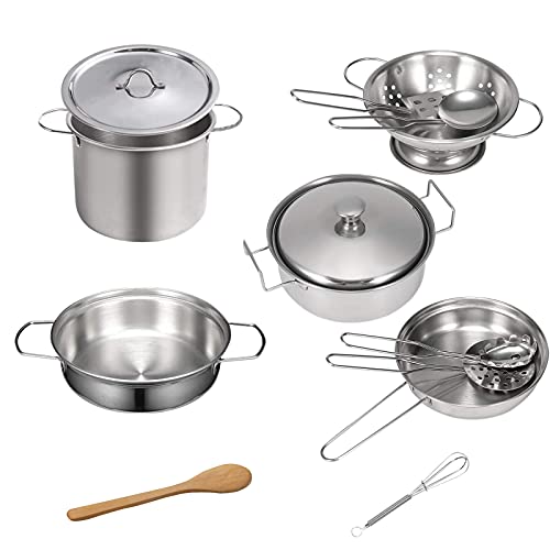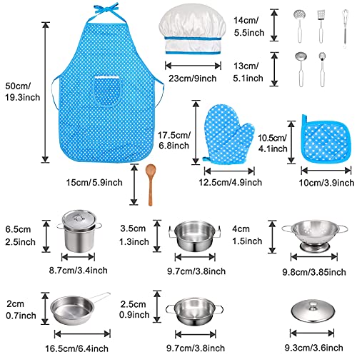 FUQUN 17 Pezzi Kit da Cucina Set da Gioco per Bambini,Set Mini Pentole e Padelle in Acciaio Inossidabile,Grembiule per e Cappello da Cuoco, Cosplay di Chef per Ragazze Ragazzi Bambini