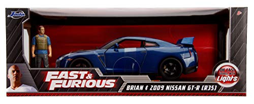 Jada Toys Fast & Furious Brian's Nissan Skyline GT-R R35, luce auto, modello tuning, scala 1:18, con spoiler, porte apribili, cofano e bagagliaio, con figura Brian O'Conner, blu
