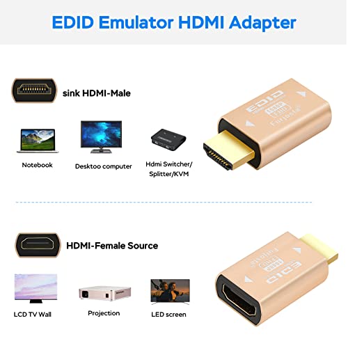 Plug & Play-Nessun driver, nessun software, nessun alimentato, supporto hot swap.Low consumo energetico. L'impostazione è molto semplice, basta collegarla al KVM in linea con l'HDMI del computer e ogni volta che si passa l'ingresso del segnale nel KVM su un altro dispositivo, il sistema Windows non ripristina il monitor.