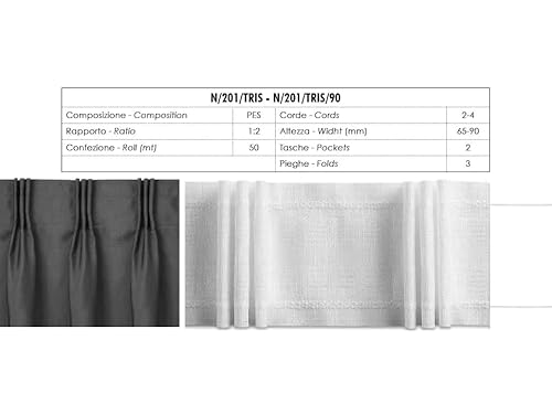 È disponibile nella versione bianca o trasparente (per le tende più leggere come l'organza) e due, tre o quattro corde (per le tende più pesanti) nell'altezze da 30mm a 170mm. Questa è la versione bianca alta 65mm