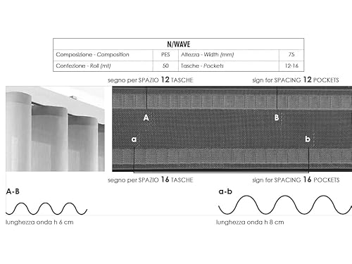 A sistema aperto, il tessuto si ritrae raccogliendosi con estrema precisione. La fettuccia wave ha un passo costante da 80mm o da 60mm oppure con lo scivolo standard idoneo per tende arricciate classiche