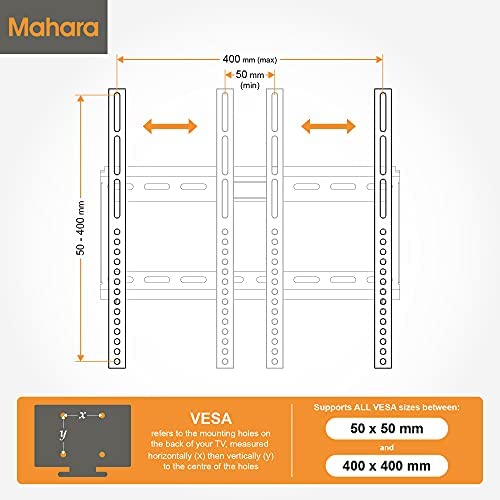 Supporto da parete compatibile con VESA. Compatibile con la maggior parte dei televisori con fori di fissaggio VESA: 50mm x 50mm, 75mm x 75mm, 100mm x 100mm, 200mm x 100mm, 200mm x 200mm, 200mm x 300mm, 300mm x 100mm, 300mm x 200mm, 300mm x 300mm, 400mm x 100mm, 400mm x 200mm, 400mm x 300mm, 400mm x 350mm, 400mm x 400mm.